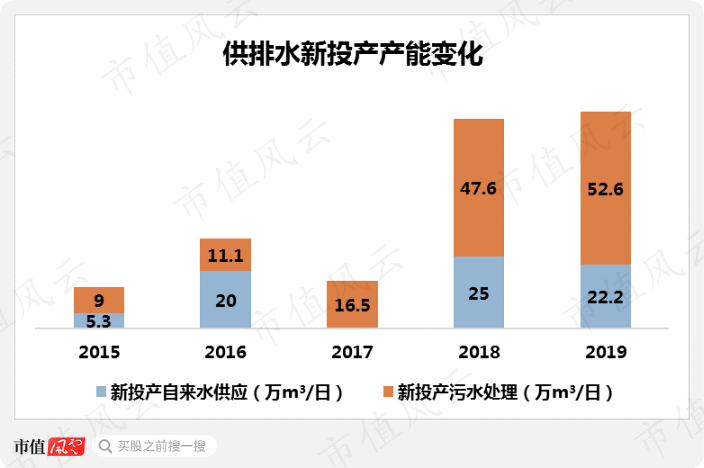 2018年开始公司加大了产能建设力度以实现“十三五”规划目标,由此导致资本开支规模迅速扩大。2018、2019两年,公司的供排水新投产产能分别达到73万m3/日及75万m3/日,远超此前三年总计62万m3/日的投产产能增量。