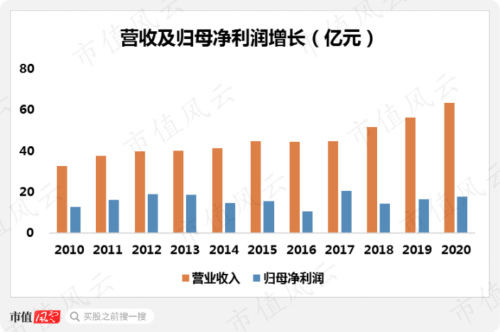 需求端的持续增长,同样带动公司的收入规模稳定扩大,营收由2010年的33亿元增至2020年的64亿元,CAGR为7%。同期,归母净利润由13亿元增至18亿元,CAGR为3%。