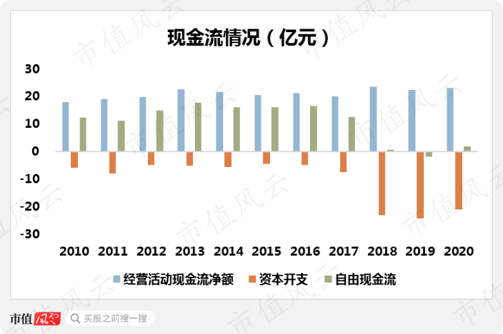上市以来,公司的经营性现金净流入规模始终保持在20亿元/年以上,2017年以前,每年的资本开支规模在5-7亿元/年,由此公司每年沉淀的自由现金流在13-16亿元左右。