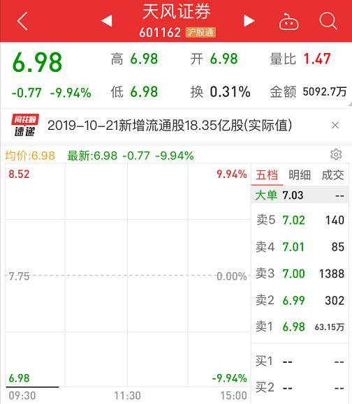 天风证券百亿市值解禁一字跌停