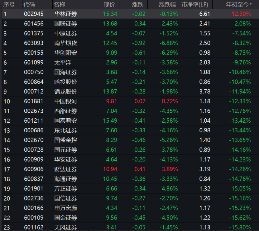 根据Wind数据,2022年年初至今,证券行业板块中48只券商概念股,仅科技金融转型力度加大的华林证券今年以来上涨12.3%,其余全部下跌,东方财富下跌最多达到34.63%,天风证券也下跌了15.8%。