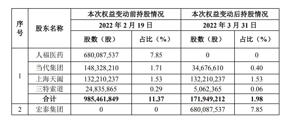 2022年2月25日至2022年2月28日,当代集团通过大宗交易方式减持公司1.14亿股股份,减持比例为1.31%。减持后人福医药及其一致行动人合计持有公司股份8.52亿股,占公司当时总股本的比例为9.83%。