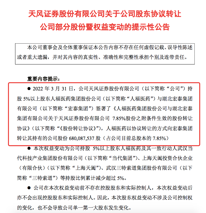4月1日,天风证券公告,持股5%以上股东人福医药拟将其所持占公司目前总股本7.85%的股权全部转让,接盘方为湖北省财政厅旗下湖北宏泰集团有限公司,转让价格21.24亿元。