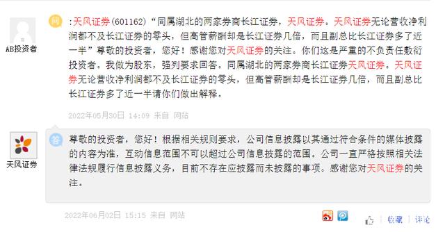 另据投资人表示,“同属湖北的两家券商长江证券,天风证券。天风证券无论营收净利润都不及长江证券的零头,但高管薪酬却是长江证券几倍,而且副总比长江证券多了近一半。”