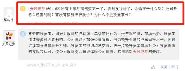甚至有投资者直接问候董事长:“所有上市券商倒数第一了,跌到发行价了,余磊在干什么啊?公司是怎么经营的啊?有没有措施维护股价?为什么不更换董事长?”