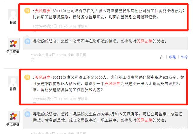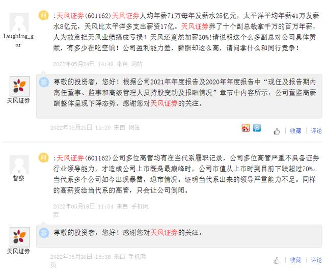 也有不少投资者表示,天风证券人均年薪71万每年发薪水25亿元,太平洋平均年薪41万发薪水8亿元,天风比太平洋多支出薪资17亿。天风证券养了十个副总裁拿千万的百万年薪,人为故意把天风业绩搞成亏损!天风还竟然加薪30%!