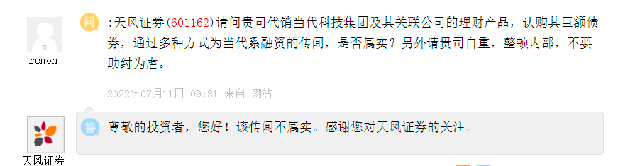 除此之外,还有投资者曾询问天风证券:贵司代销当代科技集团及其关联公司的理财产品,认购其巨额债券,通过多种方式为当代系融资的传闻,是否属实?