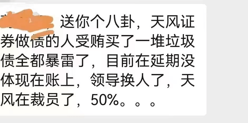 此前有网传截图称,天风证券买垃圾债暴雷,“目前在延期没体现在账上,领导换人了,天风在裁员……”。