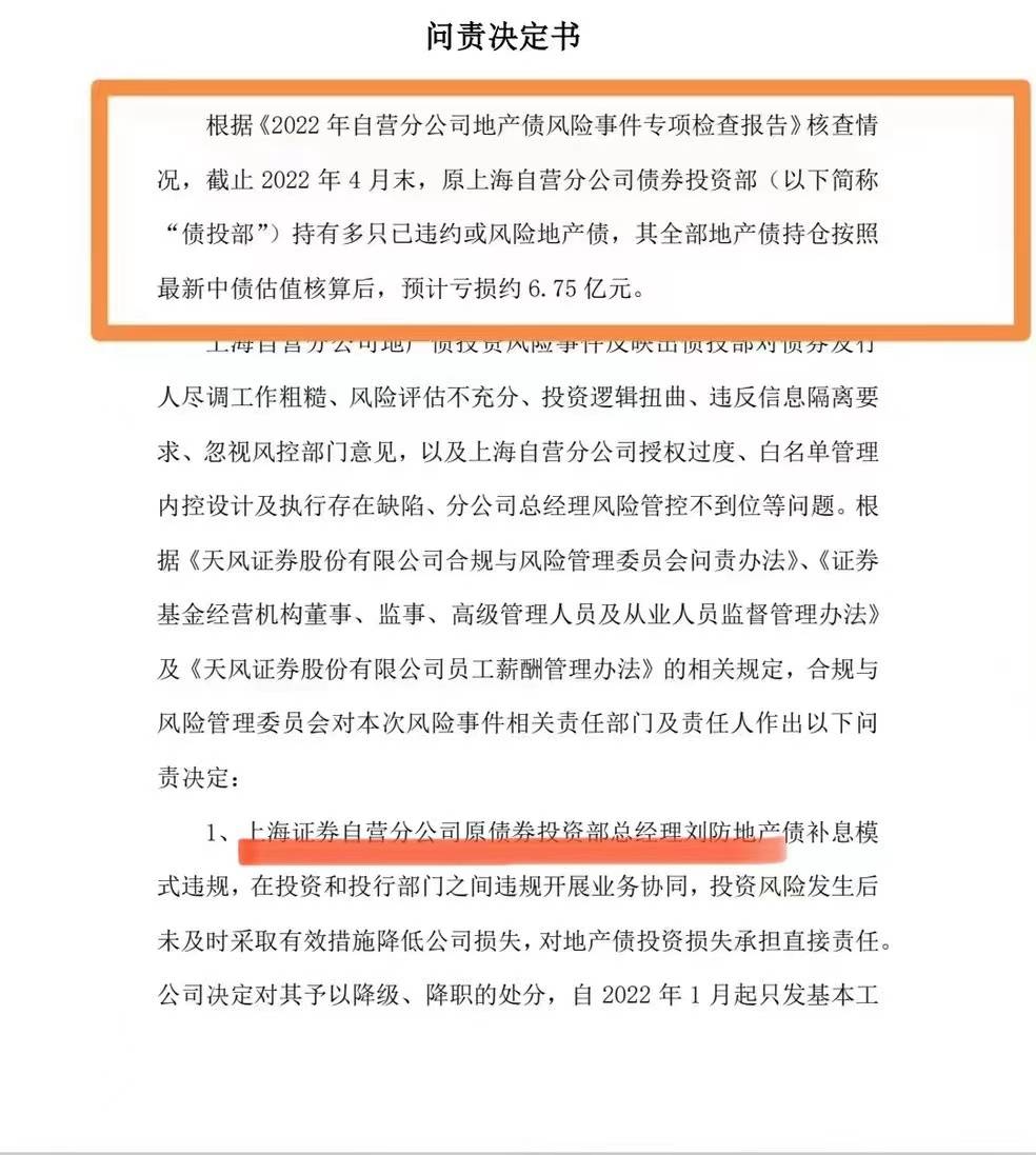 据网传《问责决定书》,截止2022年4月末,天风证券原上海自营分公司债券投资部(以下简称“债投部”)持有多只已违约或风险地产债,其全部地产债持仓按照最新中债估值核算后,预计亏损约 6.75 亿元。
