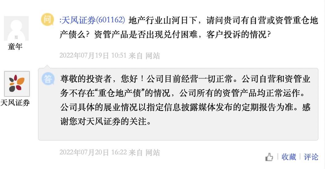 7月19日,有投资者在互动平台提问天风证券,“地产行业山河日下,请问贵司有自营或资管重仓地产债么?资管产品是否出现兑付困难,客户投诉的情况?”