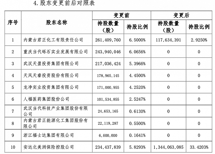 根据华泰保险3月18日发布的公告,当代集团控股的另外两家公司重庆当代砾石实业发展有限公司、武汉天盈投资集团有限公司已将持有的全部股权转让给了安达北美洲保险控股公司。此前,上述两家公司分别持有华泰保险2.44亿股(占比约6.07%)、2.17亿股(占比约5.4%),为第五和第七大股东。