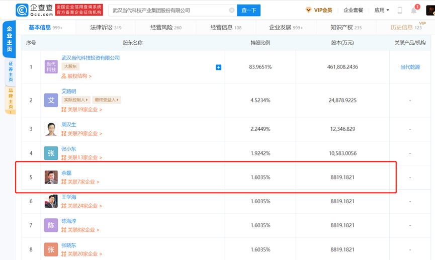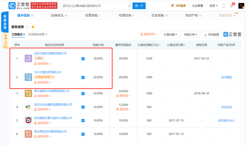 长众所大股东为武汉天盈投资集团有限公司,占股比例30%,而天盈投资大股东则为当代科技,持股40%。