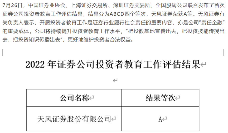 天风证券在投资者教育工作评估中获A等