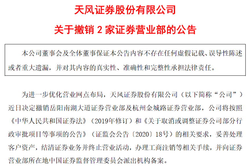 然而,仅过了几天,天风证券就发公告称撤销2家营业部,把7月初撤销的北京诺德樊羊路营业部算在内,今个月天风证券已撤销了3家营业部。