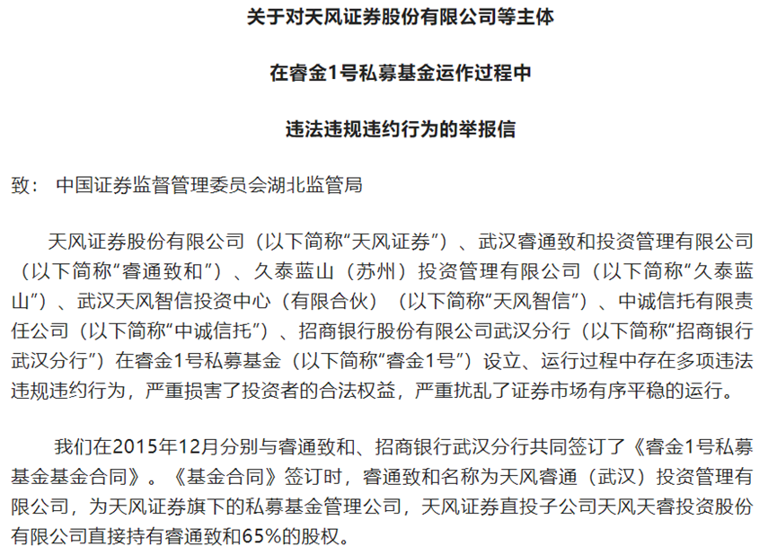 近日,网上流传一封致湖北证监局的《对天风证券等主体在睿金1号私募基金运作过程中违法违规违约行为的举报信》,信中强调: