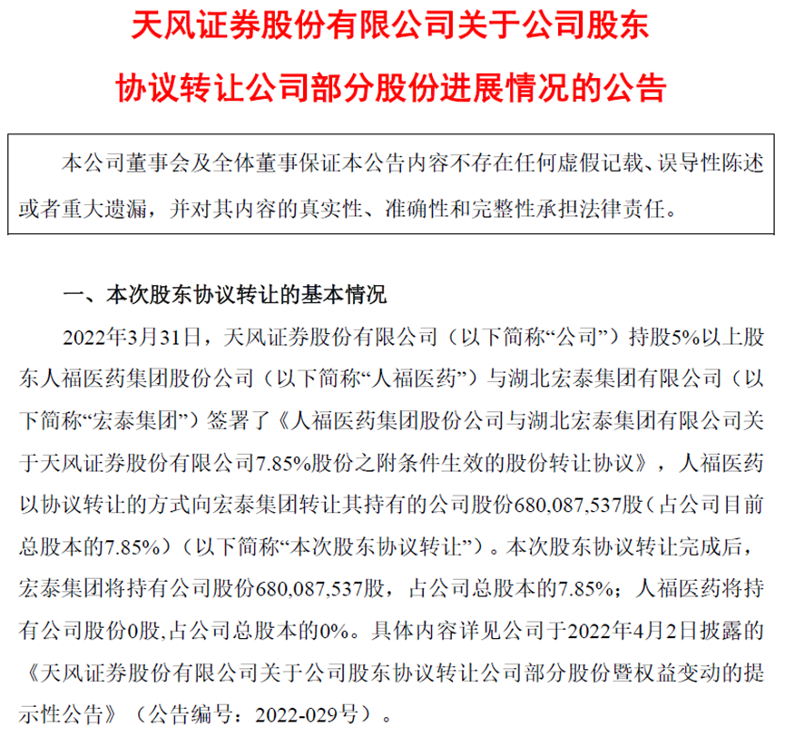 7月25日,天风证券发公告称,收到《湖北宏泰集团有限公司第一届董事会第一次会议决议》,审议通过了宏泰集团以21.24亿元价格收购人福医药持有的天风证券7.85%股权及相应资金来源事宜。