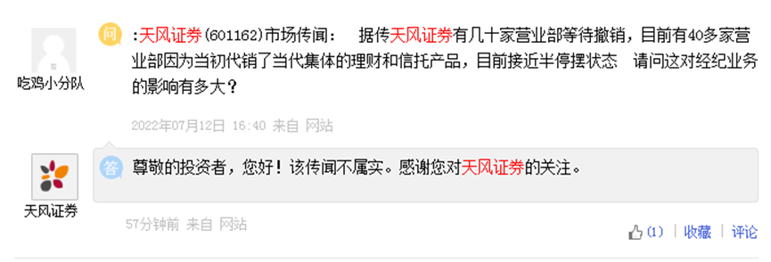 7月12日,有投资者在互动平台就天风证券40多家营业部接近半停摆状态的传闻发问,该投资者甚至质疑,相关传闻是否与天风证券代销当代系产品有关。