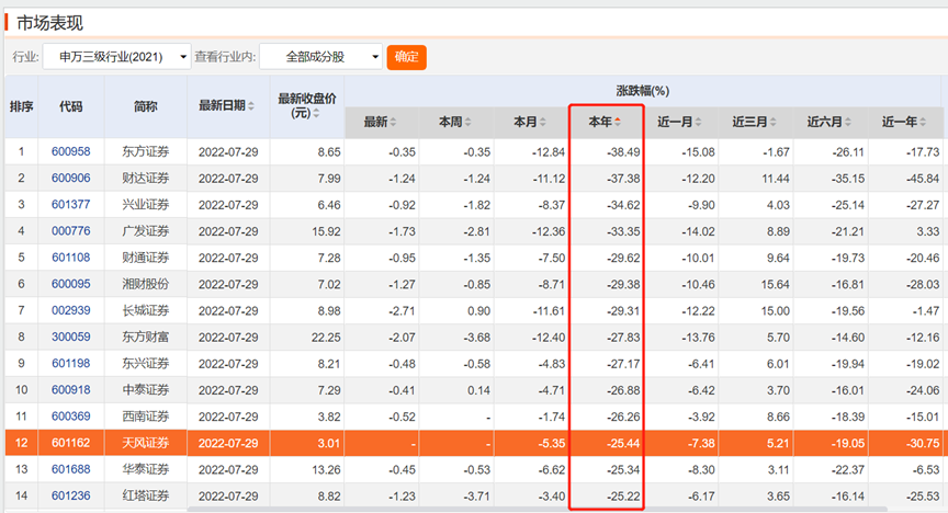 截至7月29日,天风证券收盘价为3.01元,年内跌幅达到25.44%,在48家上市券商中排倒数第12。