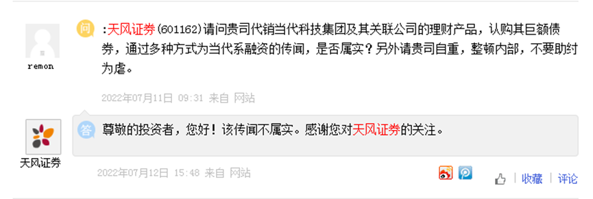 有投资者在网上互动平台询问:“天风证券代销当代科技集团及其关联公司的理财产品、认购其巨额债务,还通过多种方式为当代系融资的传闻,是否属实?”