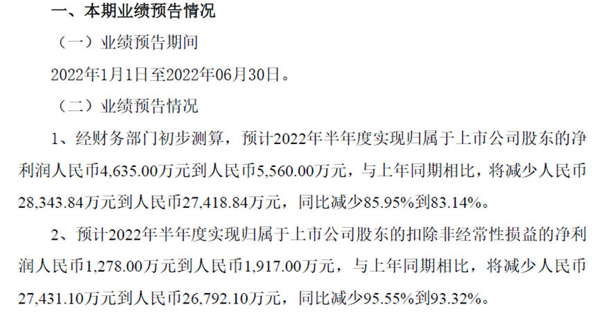 预计今年半年度归母净利润4635万元到5560万元,与上年同期相比,同比减少85.95%到83.14%;