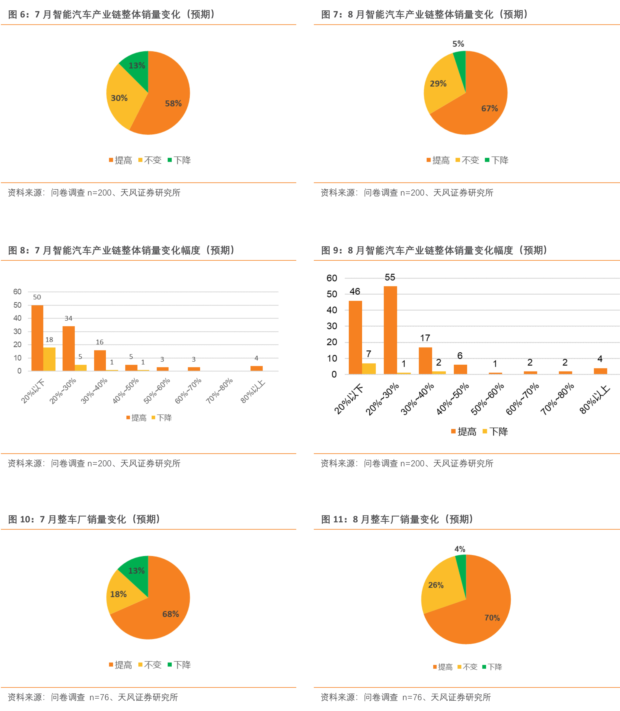 7月:据统计58%的参与者预计7月销量增加。仅13%预计销量下降(预计销量下降的厂商中仅10个样本来自整车厂)。从增长幅度看,增幅在20%以下居多。