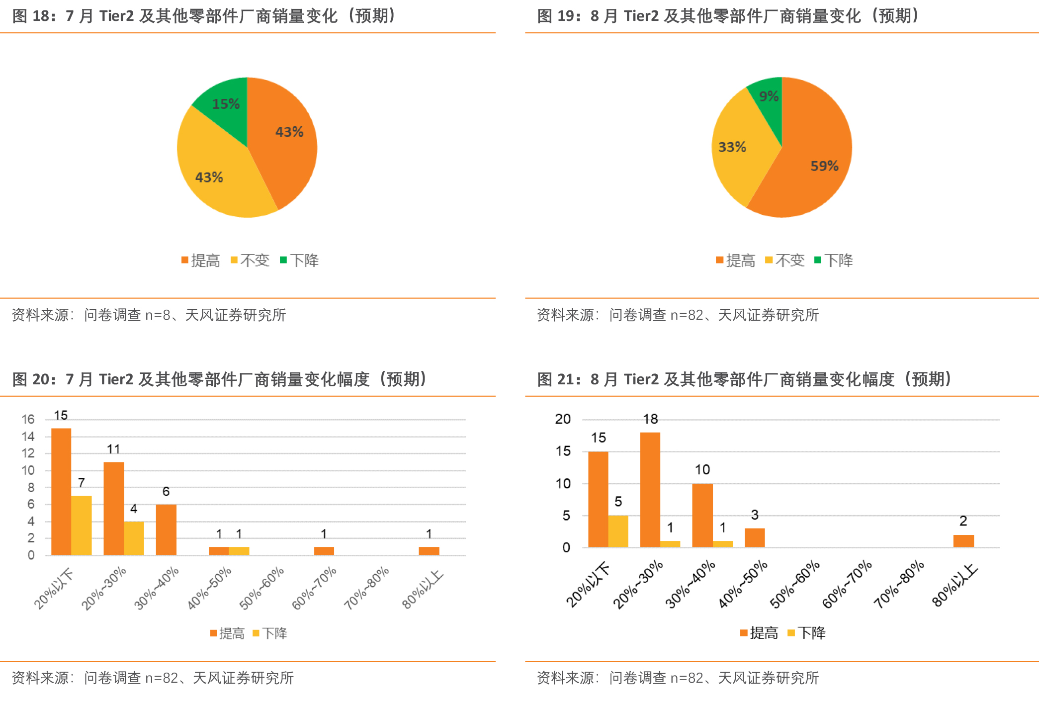 7-8月供应商销量变化幅度预期略强于整车厂。整车厂预计销量变化幅度主要分布在20%以下区间, Tier1、Tier2及其他零部件厂商销量变化主要分布在30%以下区间。