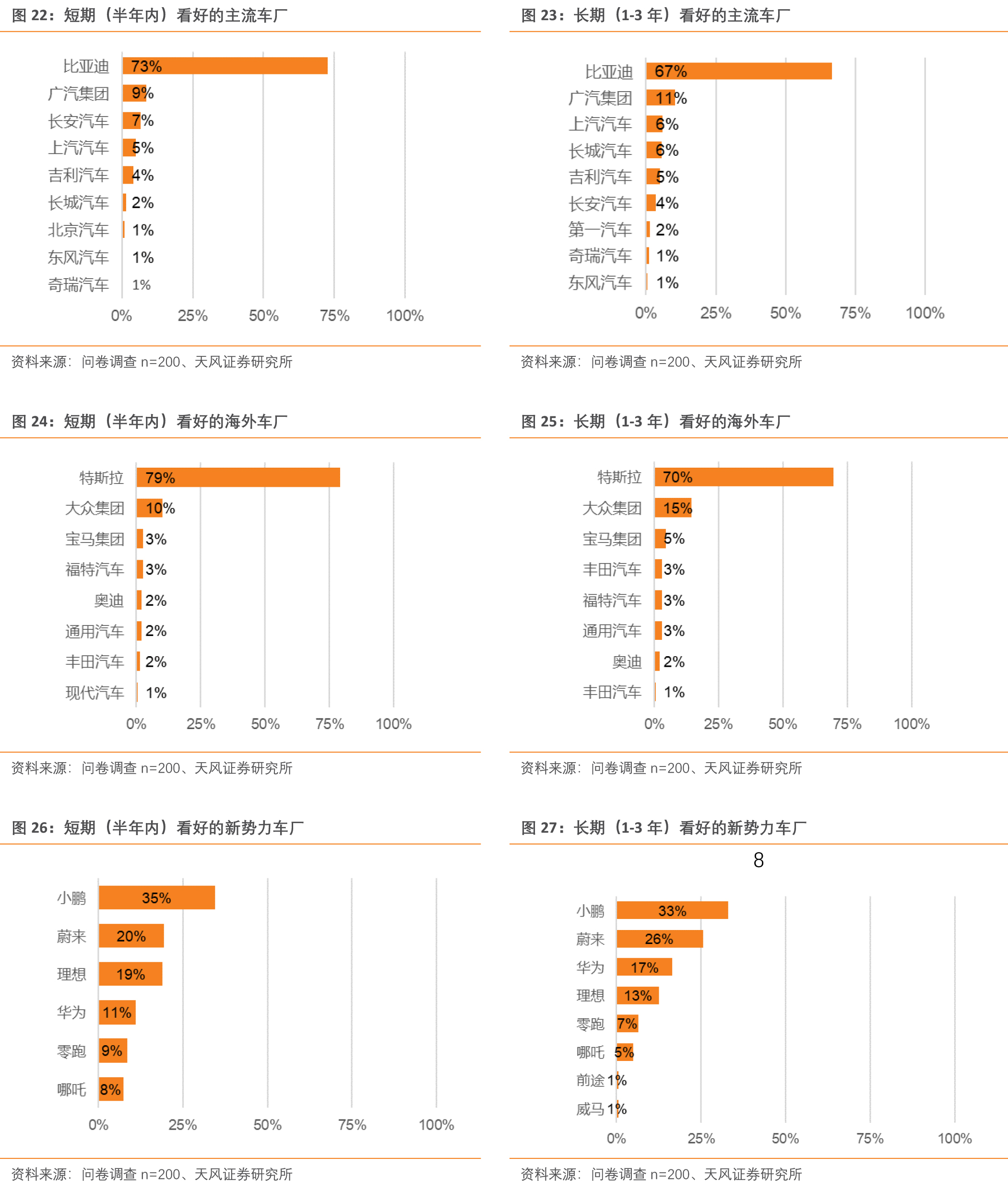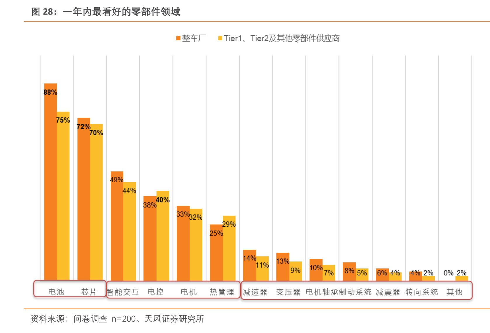 数据展现出来对于看好的汽车品牌排序和上半年销量排名明显正相关。其中较为特殊的是新势力中的华为,相较于其上半年的销量、产业链明显给予了提前的认可,华为产业链值得重视。而近年来交付亮眼的哪吒、零跑,从调研结果来看还没得到产业链的普遍认可。