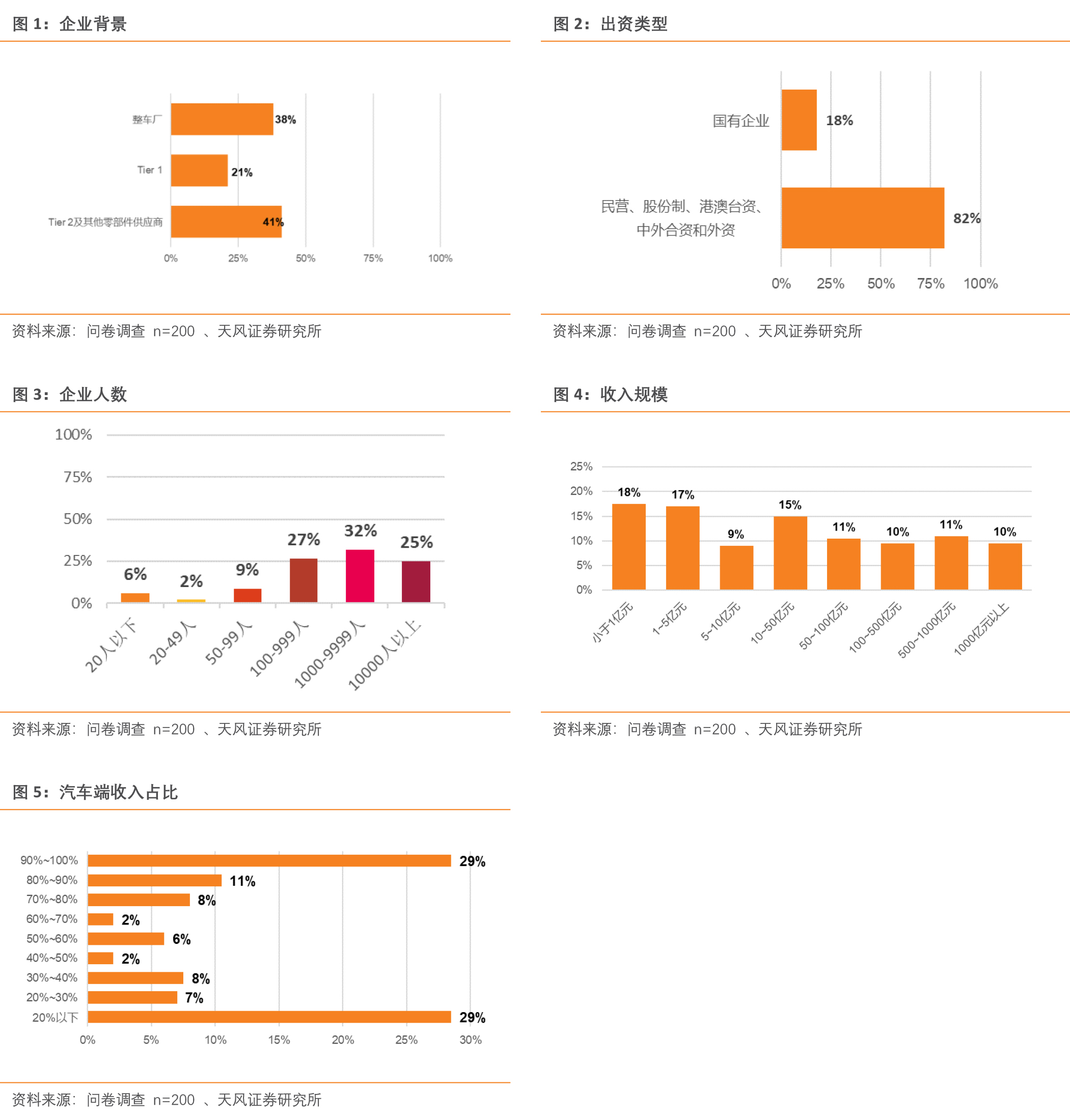 基于样本数量、代表性的考虑,天风数据研究团队选取了具备代表性的200位汽车产业人士,包括研发、生产、销售、采购、管理等一线和管理人员。其中从业所属来看整车厂占比38%(76位),Tier 1零部件供应商占比21%(42位),Tier 2及其他零部件供应商占比41%(82位)。