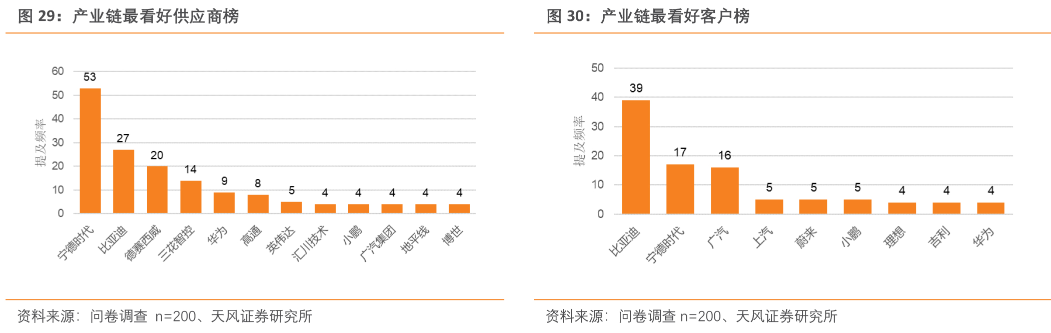 主机厂与零部件互相看好的调研环节数据显示:未来新能源车、智能车的比拼,一方面是产品力。但在产业高速发展的情况下,产业链的比拼某种程度上更为关键,从这个角度而言,比亚迪具备完整的供应链优势。而在产业看来,宁德时代仍然地位超然,占据了电池环节的龙头位置,在成本规模上具备优势。而非核心部件、非车厂必须掌握的零部件领域,如热处理的三花、智能座舱的德赛。随着国产新能源车的崛起,有望诞生一批优秀的零部件公司。
