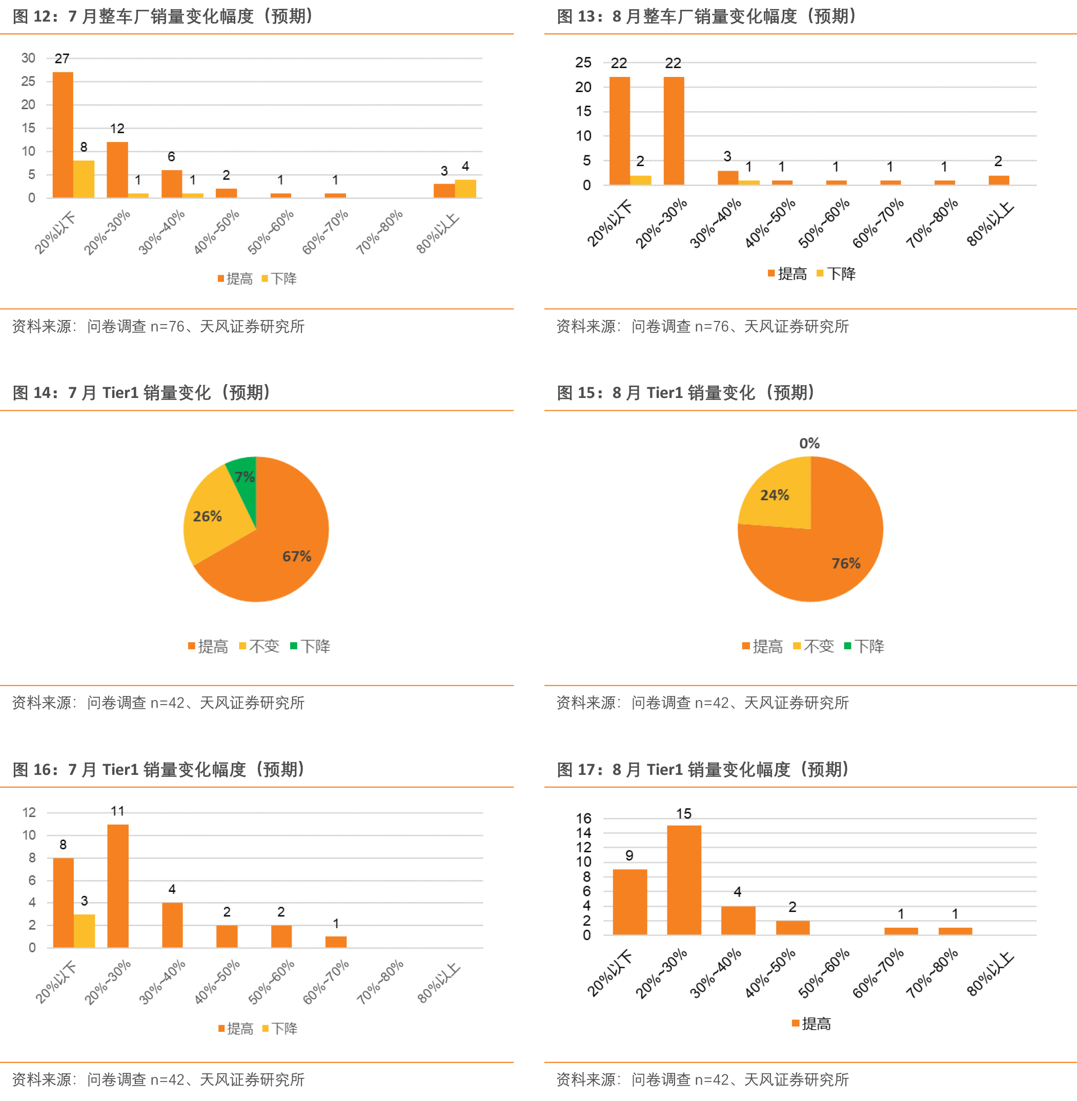 8月:厂商对销量的预判乐观,仅5%预计8月销量下降(预计销量下降的厂商中仅3个样本来自整车厂),67%预计销量环比提高。从销量变化幅度看,增幅集中在20%-30%区间,23%增幅在20%以下。