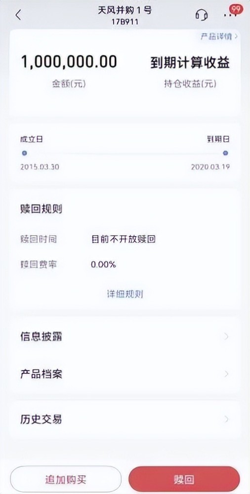 路演资料显示,天风证券主要从公司实力、过往并购项目成功案例、管理团队资历等方面向投资人宣传其运营天风并购基金的优势。“当时,天风证券主要在招商银行各地私行进行现场路演,向投资人宣传该产品具有多重保障,我们也是相信天风证券以及招商银行的招牌才购买这款产品”,投资人梁女士于2015年3月购买了100万元一期资管计划,目前手机APP上显示不开放赎回。投资人王先生也向《中国科技投资》记者表示,其于2016年3月购买了100万元二期资管计划,除了3个已退出项目进行每百万认缴出资分配现金4.16万元外,其余的本息均未兑付。据了解,一期资管计划及二期资管计划属于私募股权产品,风险等级为R5,即可能存在计划收益不能达到投资目标或者本金损失的风险。