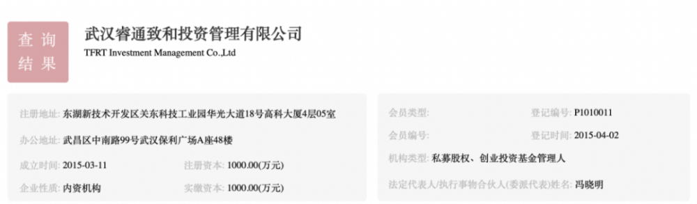 此外,按照证监会相关规定,私募基金的管理人应当在证券投资基金业协会完成备案才能够从事基金管理业务。据悉,天风睿通成立于2015年3月,备案日期为2015年4月。天风并购一期基金成立及销售时间为2015年3月,早于备案日期。企查查数据显示,2018年2月5日,天风睿通更名为武汉睿通致和投资管理有限公司(以下简称“睿通致和”)。