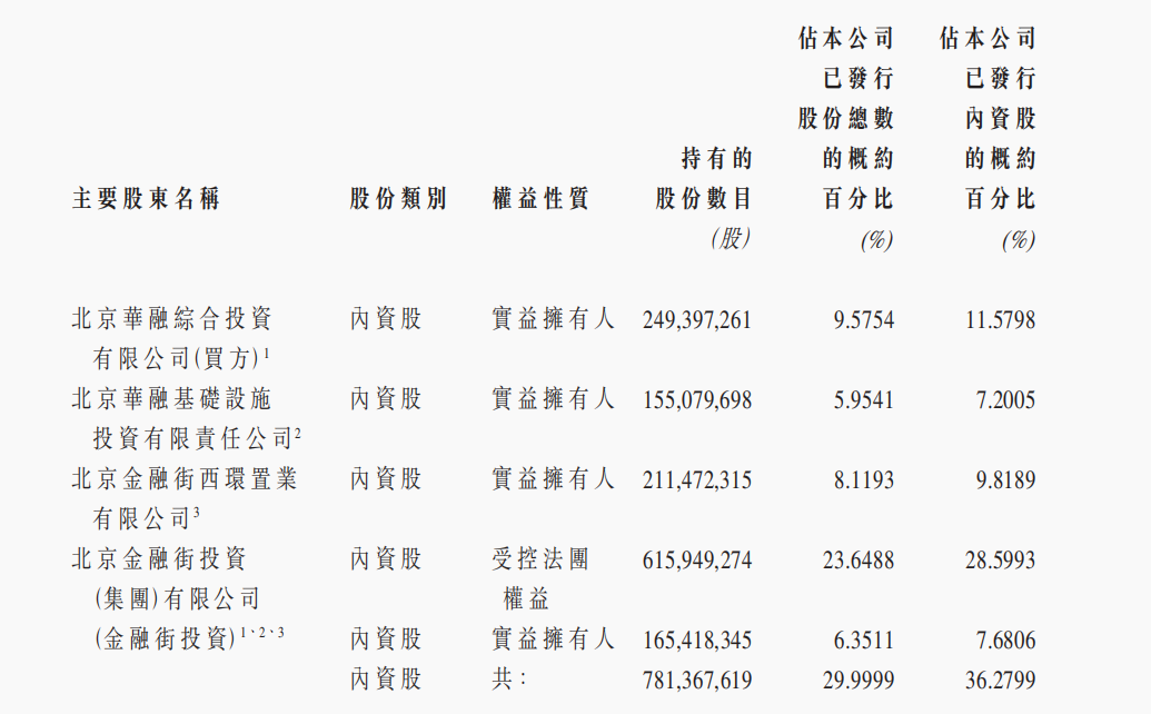 其中,北京华融综合投资、北京华融基础设施投资和北京金融街西环置业均由北京金融街投资(集团)有限公司100%持有股权。