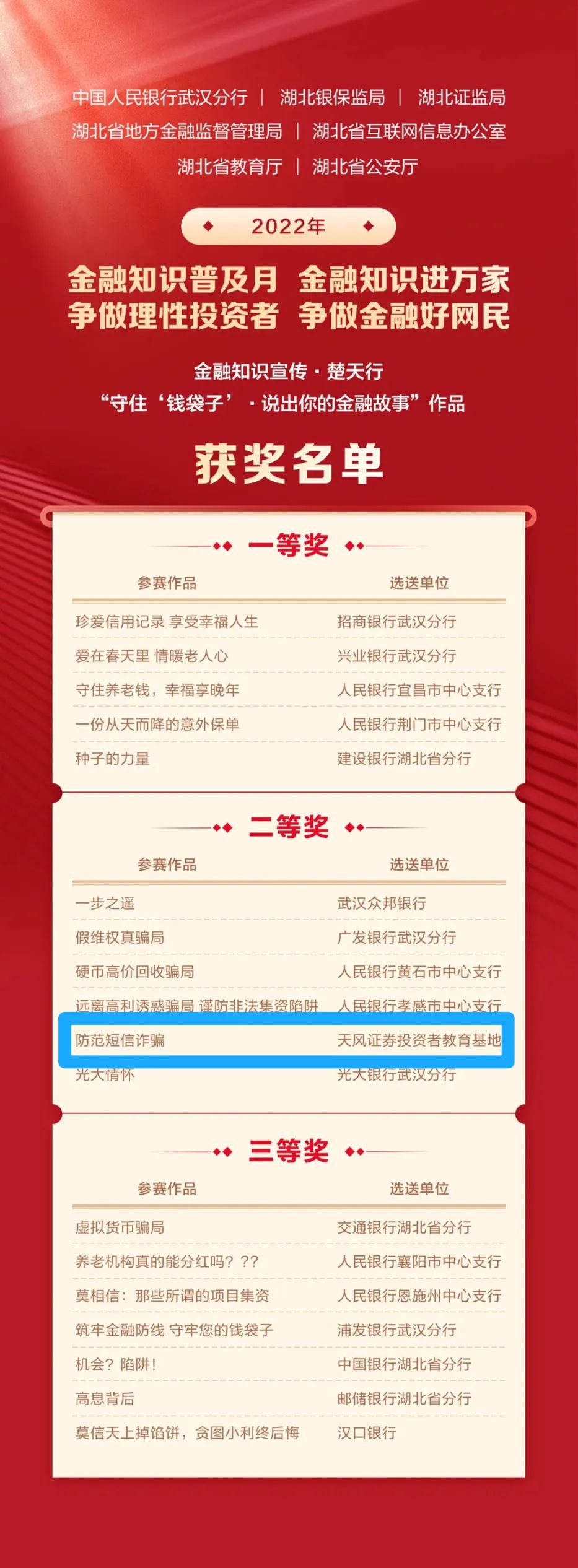 近日,由人民银行武汉分行、湖北银保监局、湖北证监局、湖北省地方金融监督管理局、湖北省互联网信息办公室、湖北省教育厅、湖北省公安厅联合主办的“2022年湖北省金融知识普及月”活动落幕,天风证券在“说出你的金融故事”优秀作品评选中荣获二等奖,这是天风证券连续第2年获得该奖项,也是此次评选中唯一获奖的证券机构。