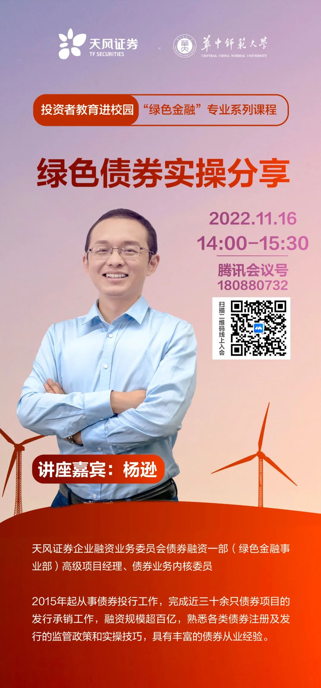 11月16日,天风证券绿色金融事业部高级项目经理杨逊先生,将为高校学生带来“绿色债券实操分享”的主题讲座,欢迎感兴趣的同学和投资者们参与。