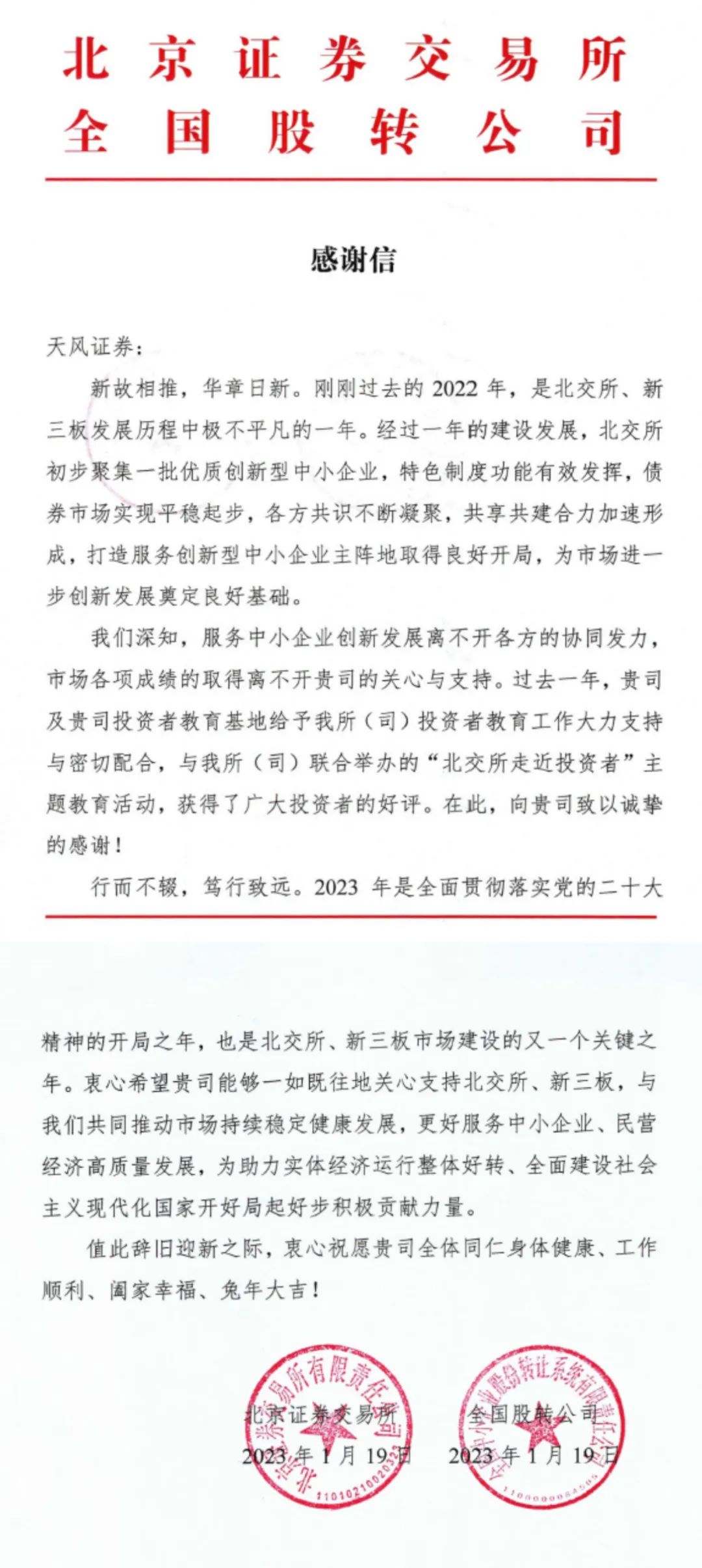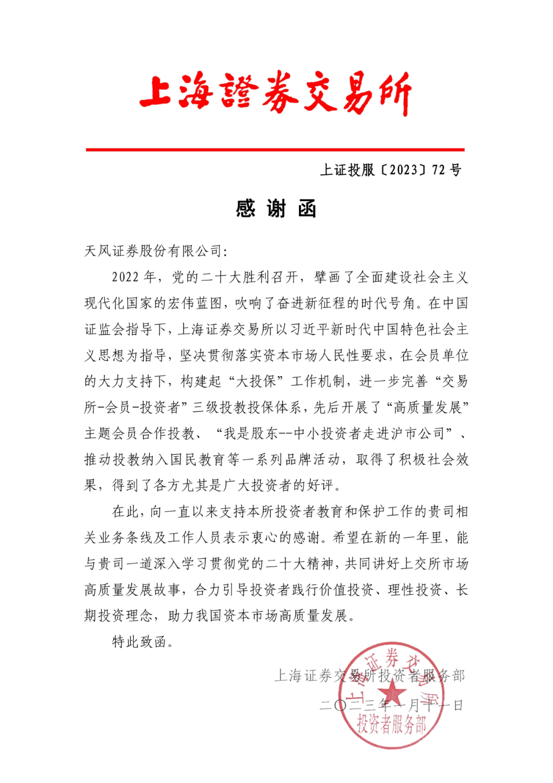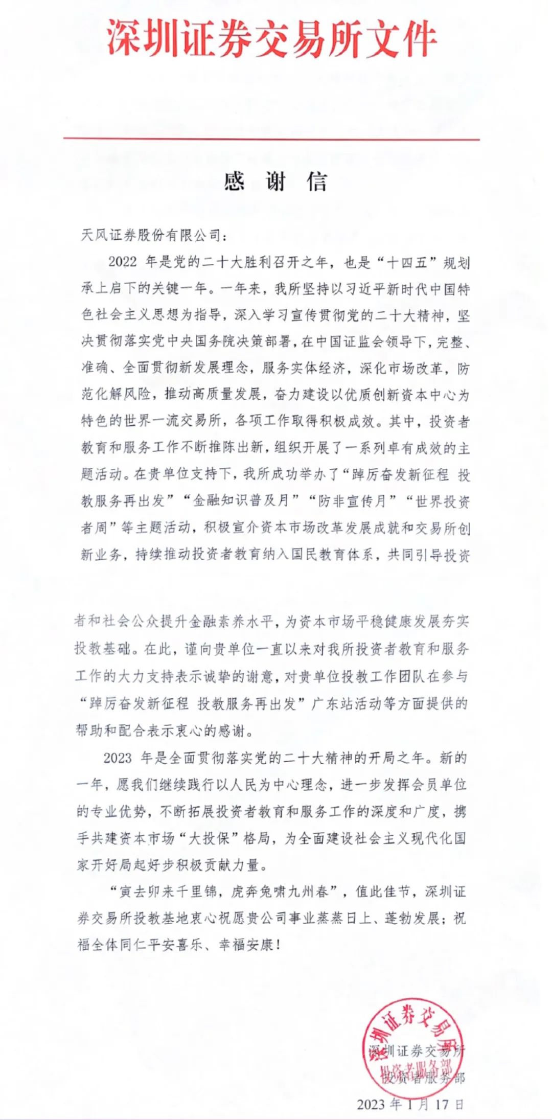 近日,天风证券陆续收到上海证券交易所(简称“上交所”)、深圳证券交易所(简称“深交所”)、北京证券交易所(简称“北交所”)及全国股转公司感谢信,来信对天风证券2022年在投资者教育相关工作的支持表示感谢。