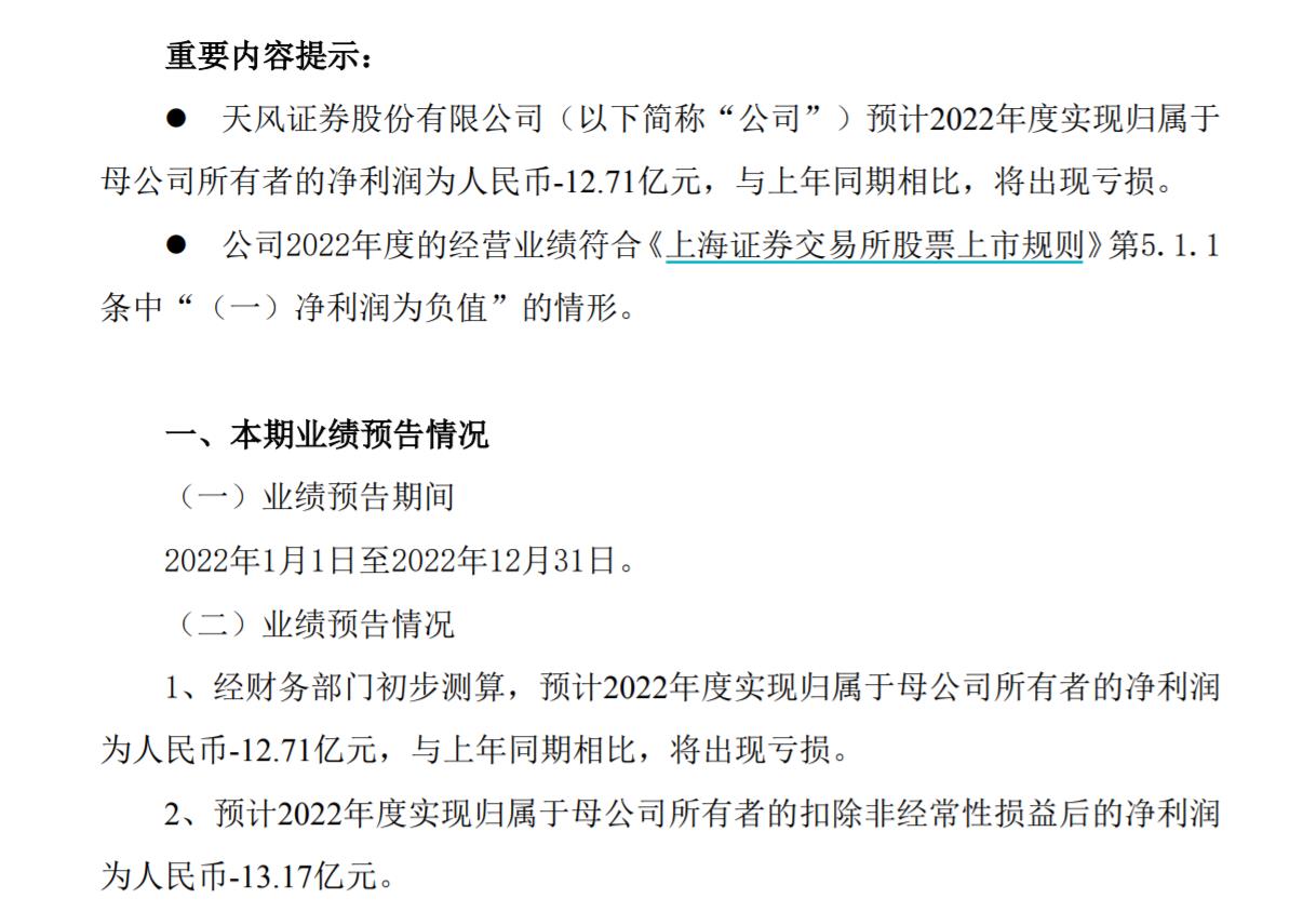 1月30日晚间,天风证券披露业绩预告显示,预计2022年度实现归属于母公司所有者的净利润为-12.71亿元,与上年同期相比将出现亏损;预计扣非后净利润为-13.17亿元。