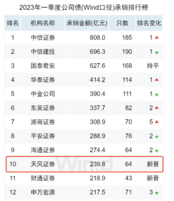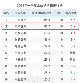 近期,数据发布一季度债券承销排行榜。天风证券一季度企业债承销只数排名行业并列第1,承销规模排名行业第2;公司债承销只数排名行业第9,承销规模排名行业第10;一季度总承销规模288.74亿元,总承销只数74只,位于行业第10。近三年,天风证券的企业债券承销规模始终保持在市场前10位,天风证券有关负责人表示,将持续挖掘中高等级优质客户、产业类客户的融资需求,大力推广优质企业债券、绿色债券、专项企业债券等创新产品,践行“十四五”规划《纲要》中“坚持创新驱动发展,全面塑造发展新优势”的新发展理念。