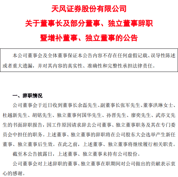 天风证券董事会迎来一波调整。董事长余磊、副董事长张军、3名董事及4名独立董事辞职,同时增补庞介民、赵晓光等5人为董事候选人,提名4人为独立董事候选人。