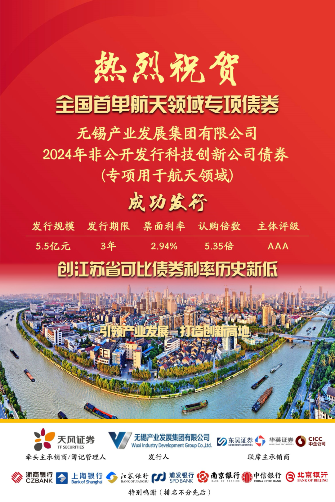 由天风证券担任债券牵头主承销商、簿记管理人的全国首单专项用于航天领域债券“24锡产K1”在上交所成功发行,发行总额5.50亿元,期限为3年,票面利率仅2.94%。
