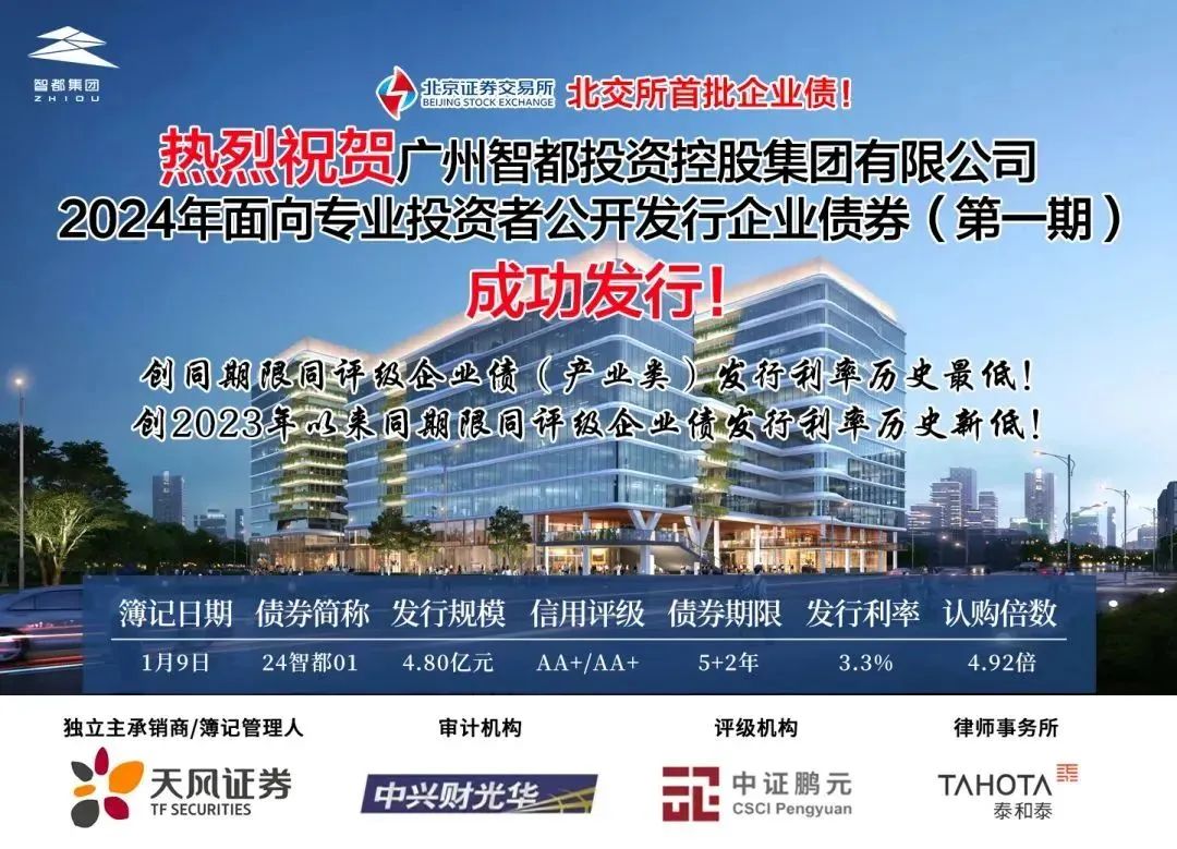 天风证券作为独立主承销商承销的“24智都01”债券于1月份在北京证券交易所成功簿记发行,发行规模4.8亿元,债券期限5+2年,票面利率3.3%,全场认购倍数4.92倍。本期债券为北交所首批受理、首批获批和首批簿记发行的信用债券。