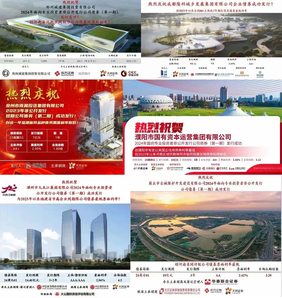 天风证券企业融资一部(绿色金融事业部)完成23南翼D2、24漳九01、23漳九3A、24濮资01、24郑城01、24商古01、24隆科01、24红开投等8只债券的承销发行,类型涉及私募公司债、公募公司债、企业债、资产证券化等品种,多只债券融资利率创地区最低记录,多途径、低成本助力各区域城市发展。债券发行规模合计76.92亿元,为公司实现收入近2000万元。在深度服务“城市投行”项目的同时,圆满完成了部门2024年开门红工作,并为条线完成一季度创收目标奠定了良好基础。