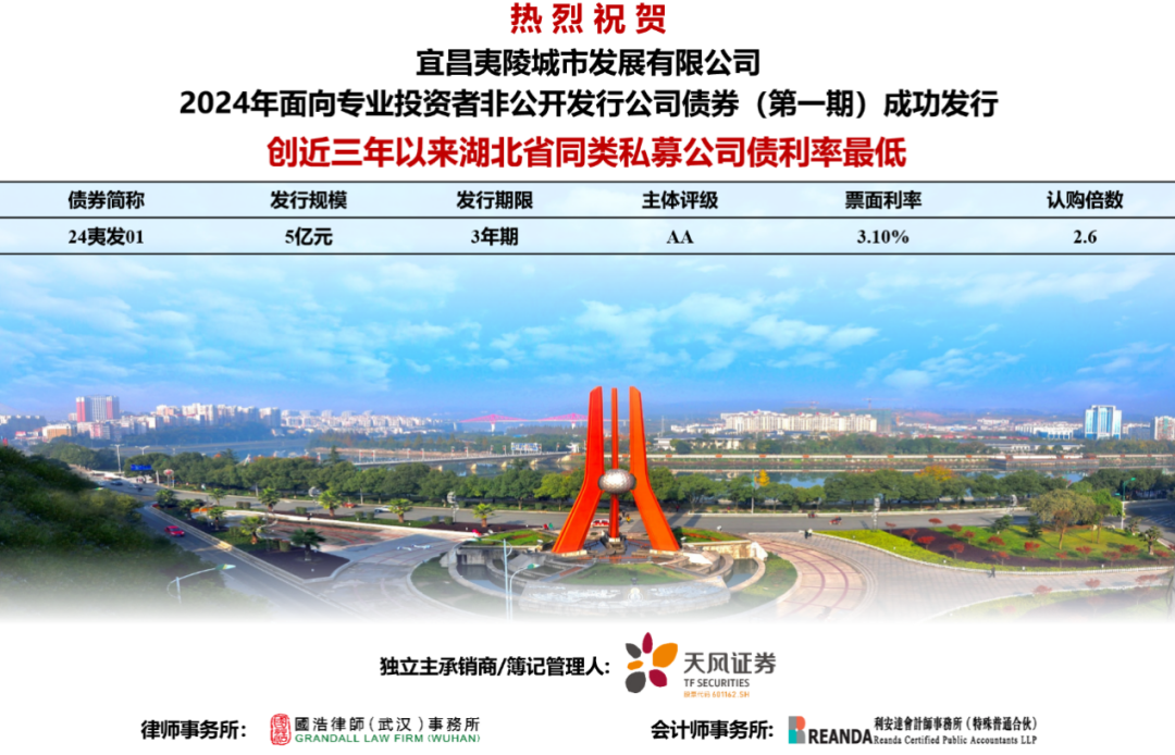 2024年4月24日,天风证券独立主承销的宜昌夷陵城市发展有限公司(以下简称“夷陵城发”、“发行人”)2024年面向专业投资者非公开发行公司债券(以下简称“本期债券”)成功发行,募集资金总额5亿元,期限为3年期,利率3.10%。本期债券票面利率创发行人所属集团历史融资最低利率,创近三年以来湖北省同类私募公司债利率最低。