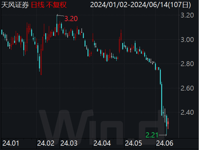 6月13日,天风证券股价收于2.28元,较6月7日跌停价再跌去3.80%,较2019年3月上市后最高价10.94元(前复权)跌去79.16%。
