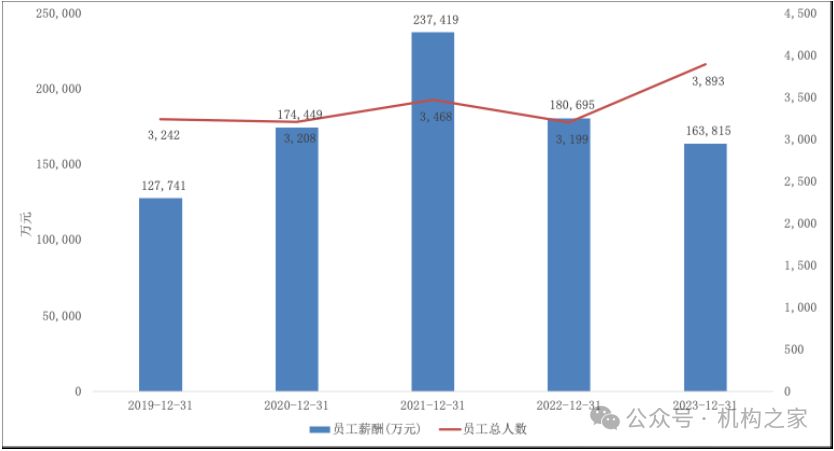 与高管薪酬上涨呈现不同景象的是,天风证券普通员工的待遇却在持续下滑。公司总薪酬从2021年的23.74亿元下降到2022年的18.07亿元,2023年进一步降至16.38亿元。据公司历年年报数据,2023年员工总数为3893人,高于2021年的3468人,员工人数上升而总薪酬开支却明显下滑,意味着员工的整体薪酬水平在2022年和2023年连续下滑。
