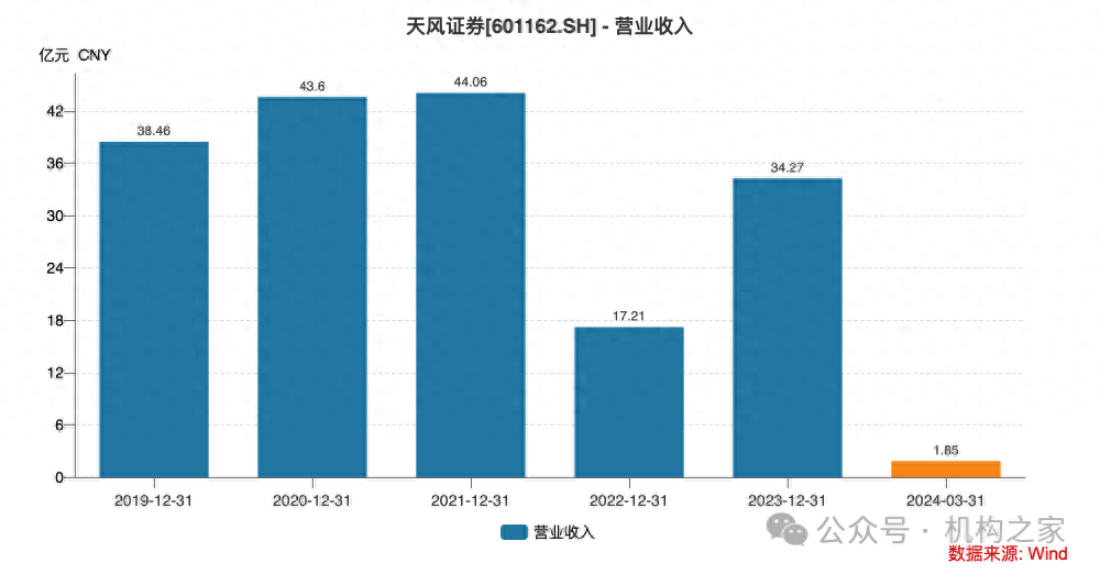 但回到问题的更底层,天风证券近年来的经营状况令人忧虑。2022年可谓系至暗时刻,当年公司收入仅为17.21亿元,较2021年的44.06亿元大幅下滑60.9%。虽然2023年业绩有所回升,达到34.27亿元,但仍未能重返2021年的巅峰。