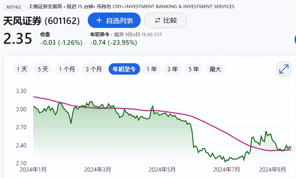 今年以来,天风证券的股价已经下跌23.95%。