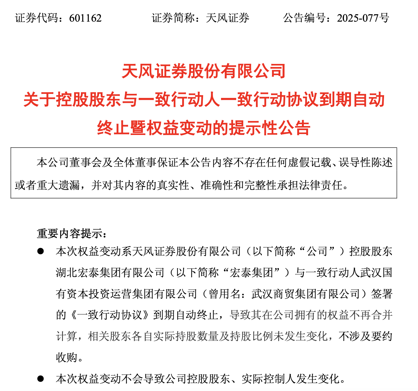 2025年12月29日,天风证券(维权)(601162)发布公告称,控股股东湖北宏泰集团与一致行动人武汉国有资本投资运营集团有限公司签署的《一致行动协议》已于12月27日到期自动终止。