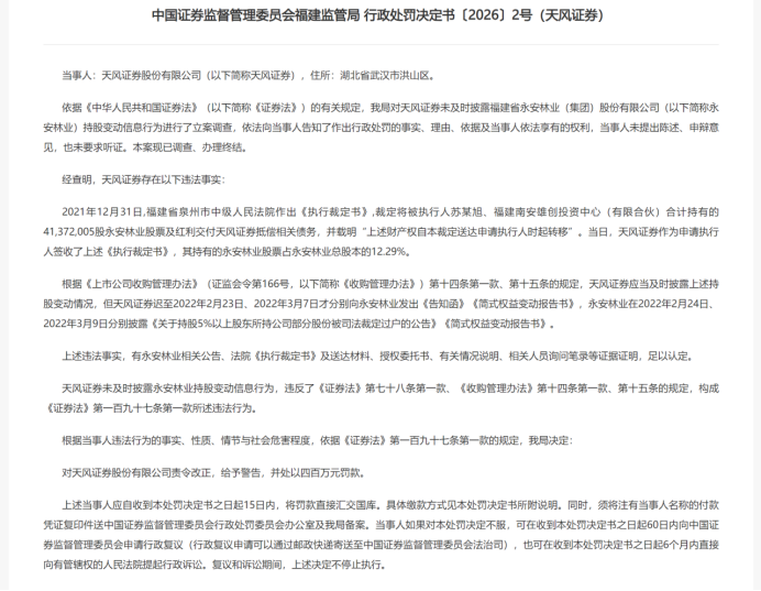 同日,福建证监局对天风证券未及时披露永安林业持股变动信息的信披违规行为作出处罚,对公司罚款400万元,对时任总裁王琳晶罚款140万元。