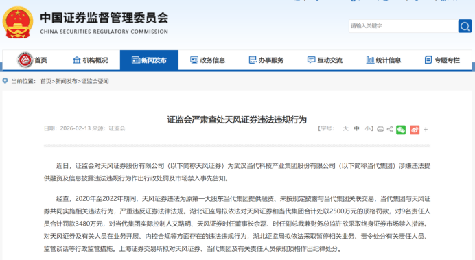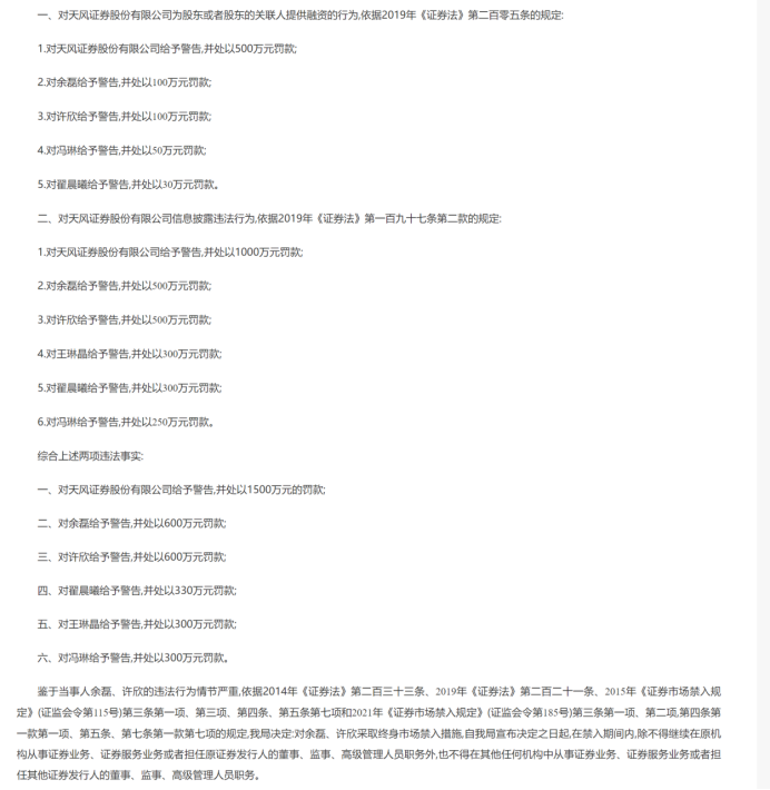近日,天风证券披露公告,公司同日收到湖北、福建两地证监局下发的《行政处罚决定书》,因违法为股东提供融资、信息披露重大遗漏等严重违规行为,合计被罚超4000万元,两名核心高管被终身市场禁入,多项业务被暂停。